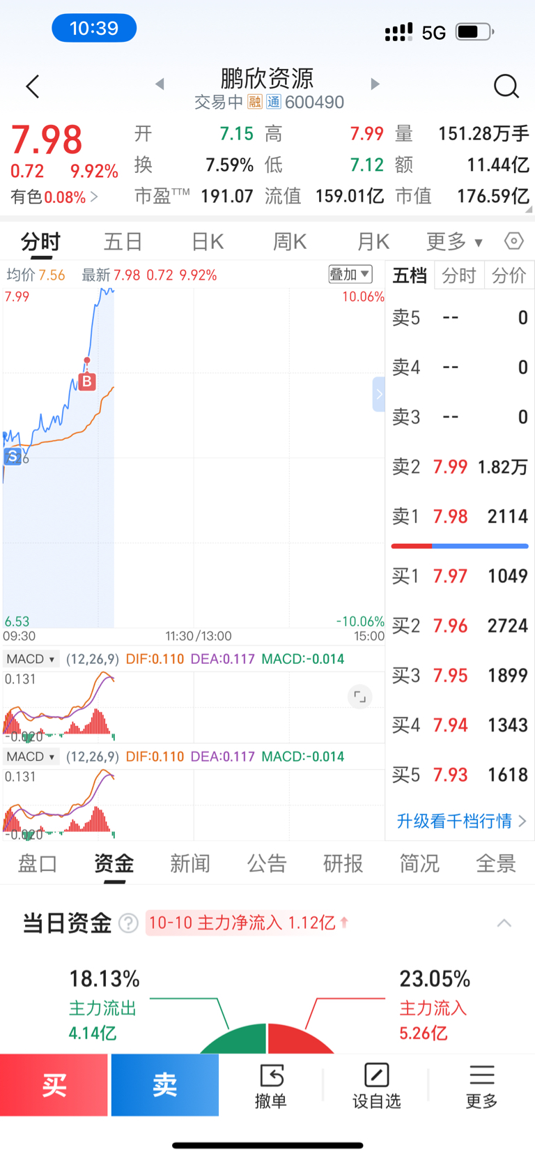 $鹏欣资源(SH600490)$ 开盘7.36买了,看它涨上去不甘心7.72又买回来了