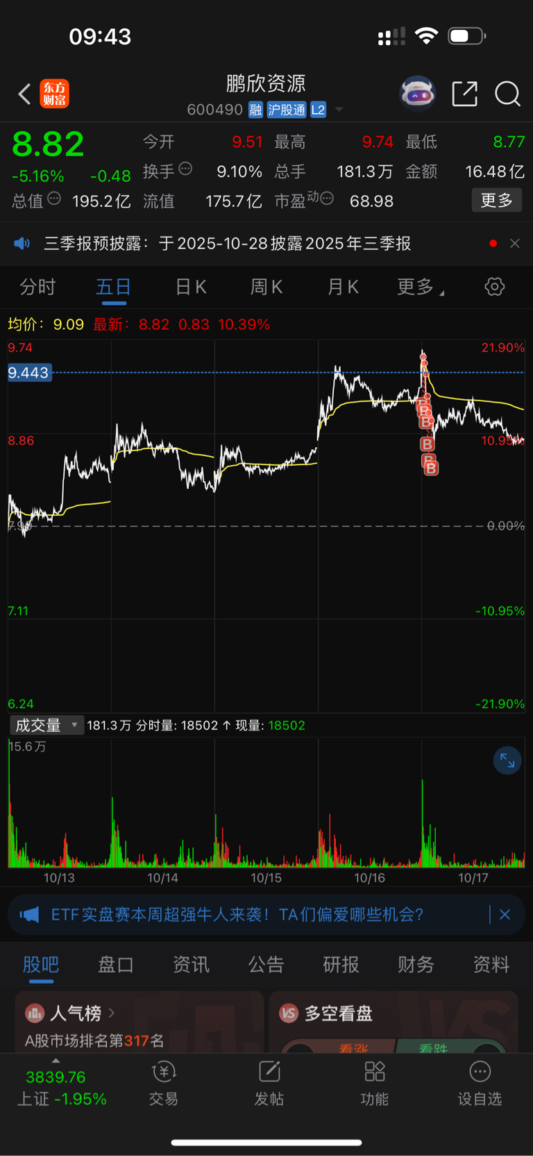 $鹏欣资源(SH600490)$ 还有比我站的高的?
