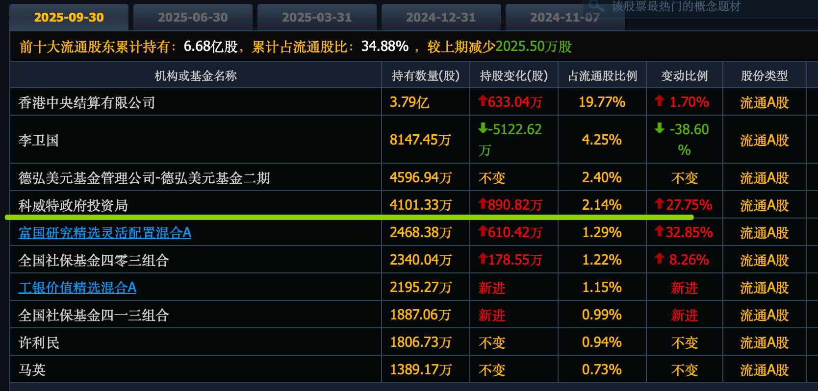 今年9月30日的三季报数据显示,科威特投资局又加仓了891万股,加仓到4101万股,已经加仓成为公司第四大股东,不仅仅如下社保基金403组合加仓到2340万股,社保基金413组合新进了1887万股。这些机构都重仓进入前十大股东了。