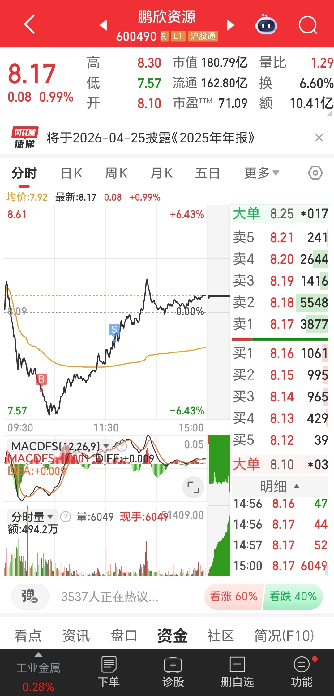 加到了最低点,张婷不卖(本周)$鹏欣资源(SH600490)$