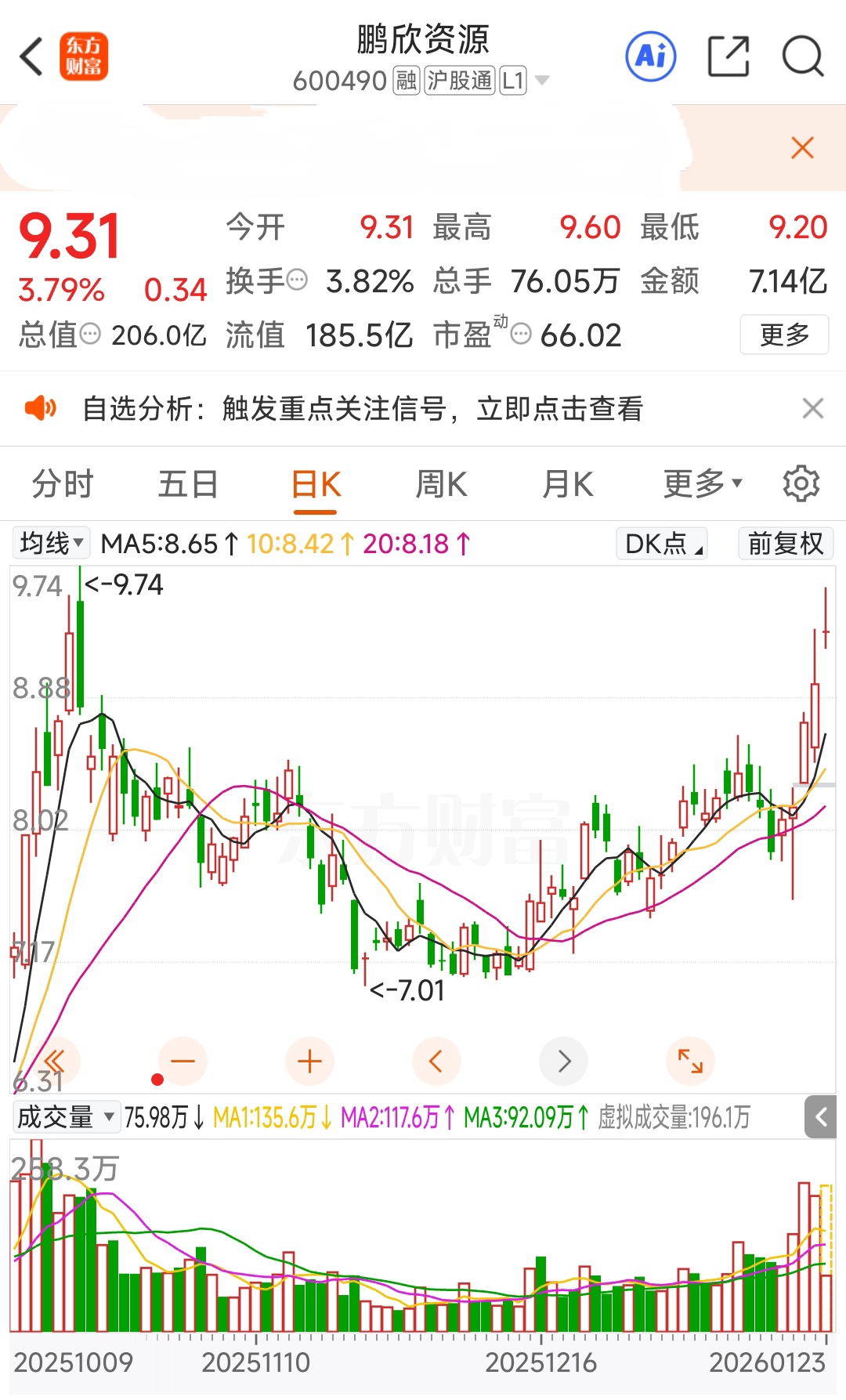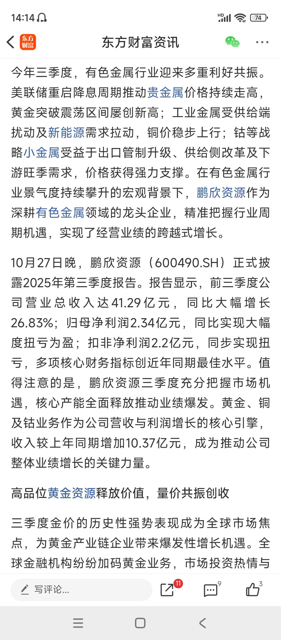$鹏欣资源(SH600490)$ 黄金+银铜钴锌镍+小金属+锂电池,突破9.74将打开上升空间。2025三季报净利润2.34亿元增299.9%,每股收益0.10元