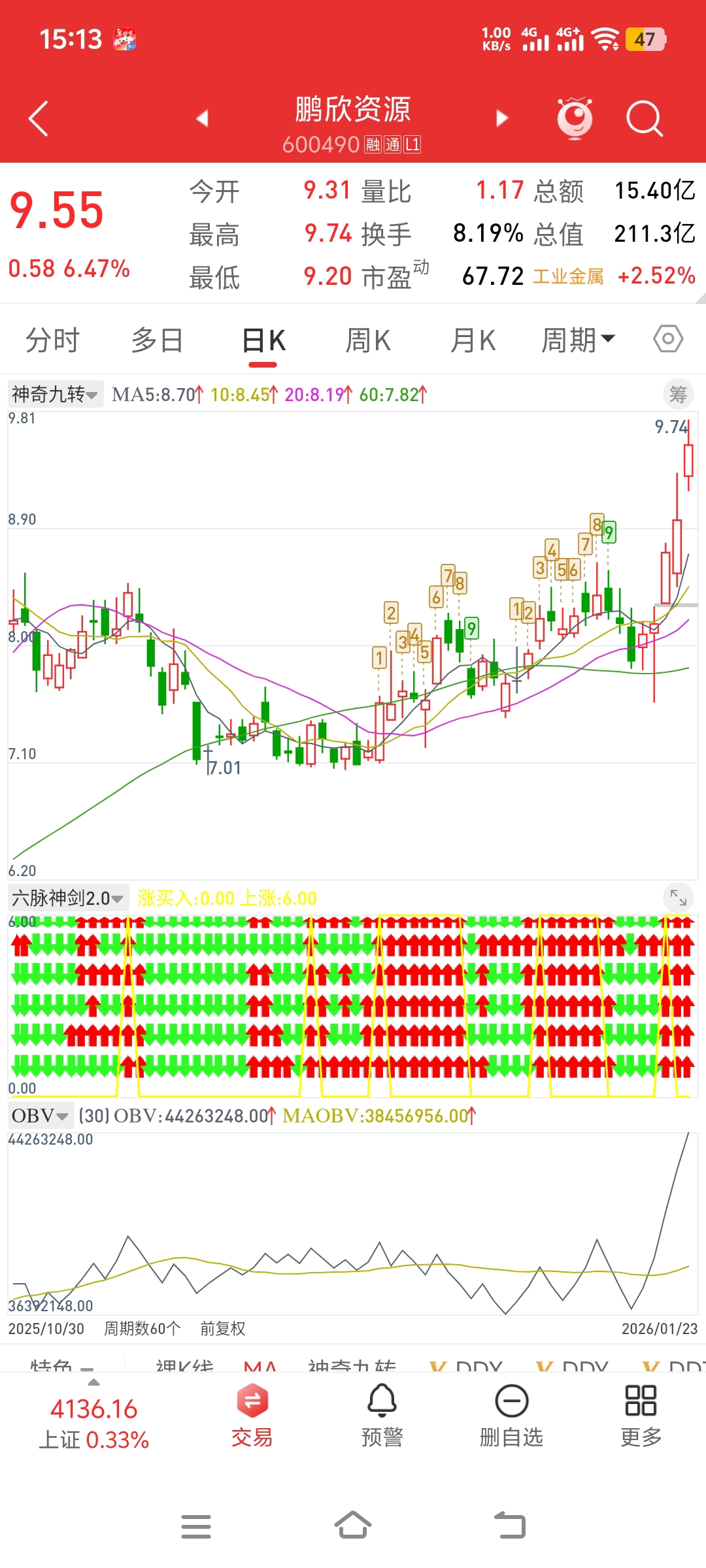 $鹏欣资源(SH600490)$ 我的六脉神剑显示不能下车,主升浪中,看前面的基本没错过