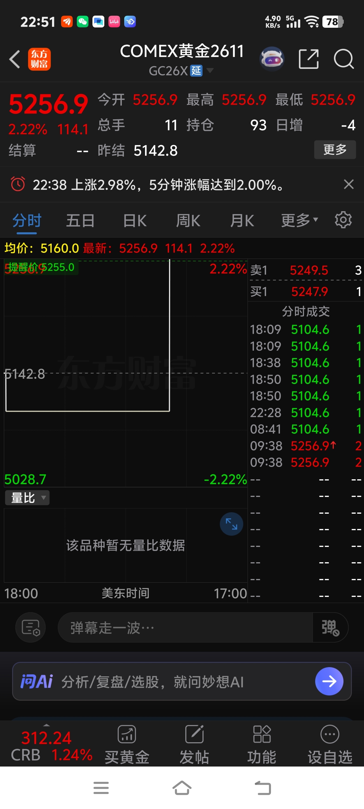 22点50分。期货黄金一飞冲天的气势