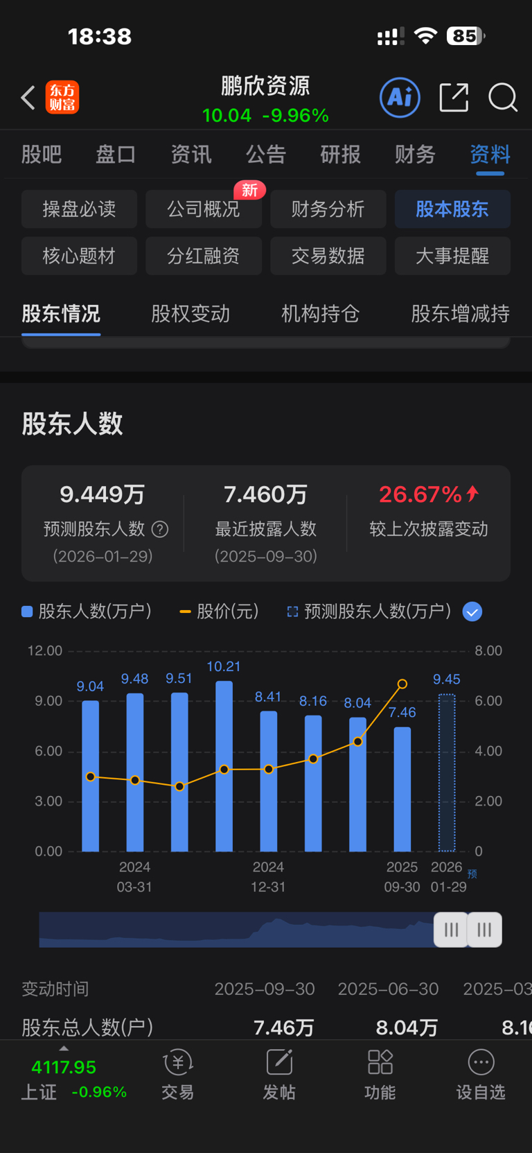 $鹏欣资源(SH600490)$ 股东人数大幅增加说明了什么?说明了越来越多的投资者看中了鹏欣资源,鹏欣资源未来钱途非常光明!