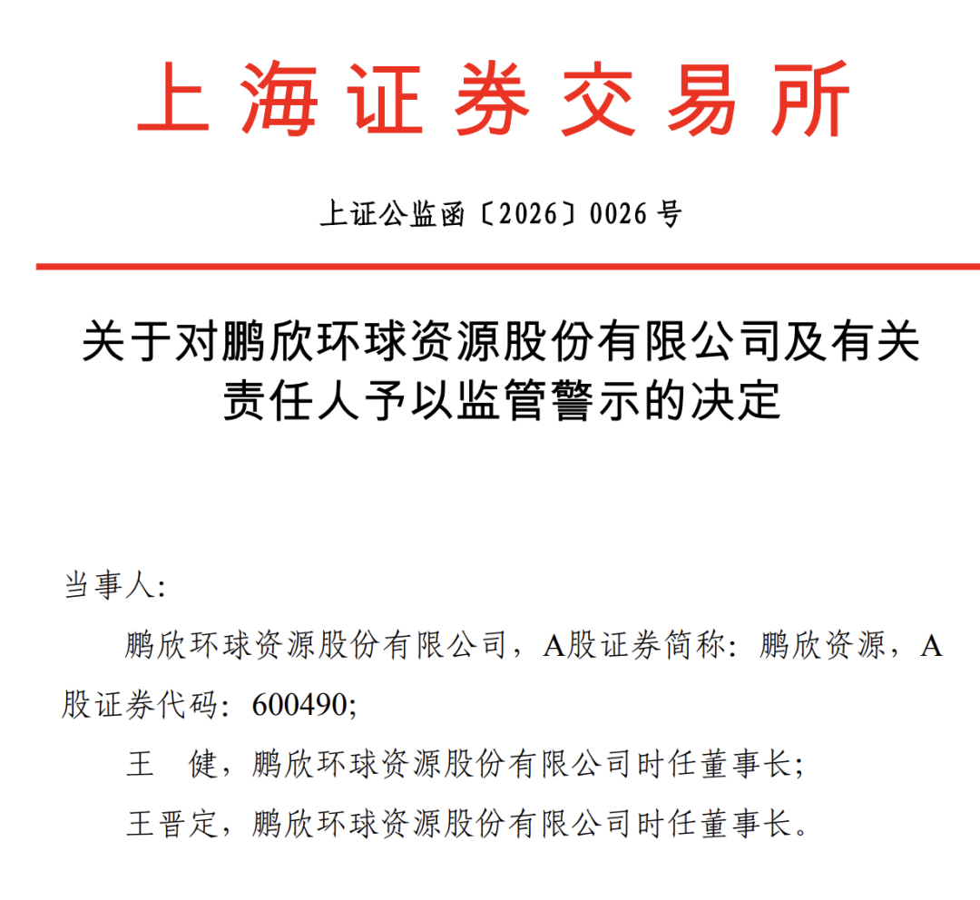2月3日,上海证券交易所发布上证公监函〔2026〕0026号监管决定,对鹏欣资源(600490)及时任董事长王健、王晋定予以监管警示。