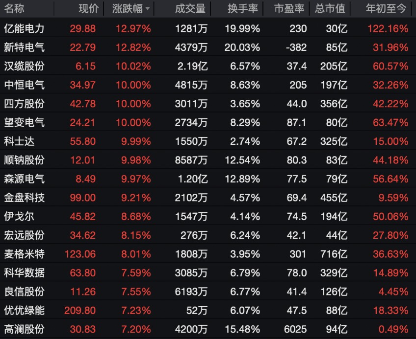 电网设备概念股走高,汉缆股份、中恒电气、四方股份等多股涨停。