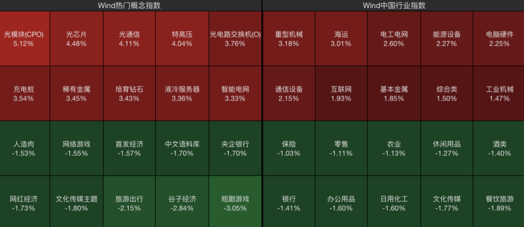 从板块来看,CPO、基本金属、电力设备等板块涨幅居前,而餐饮旅游、文化传媒、银行等板块震荡调整。