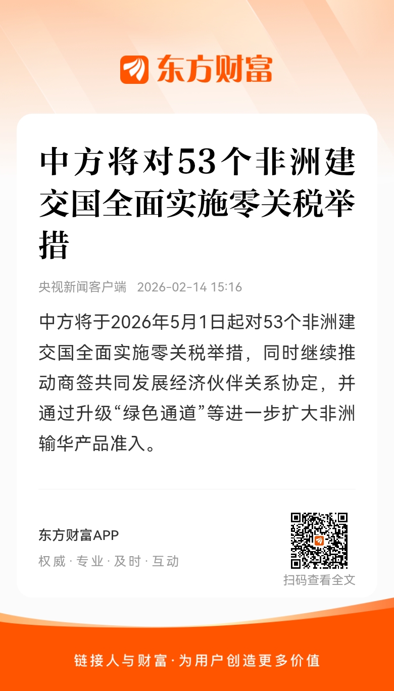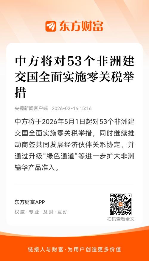 中方将于2026年5月1日起对53个非洲建交国全面实施零关税举措,同时继续推动商签共同发展经济伙伴关系协定,并通过升级“绿色通道”等进一步扩大非洲输华产品准入。