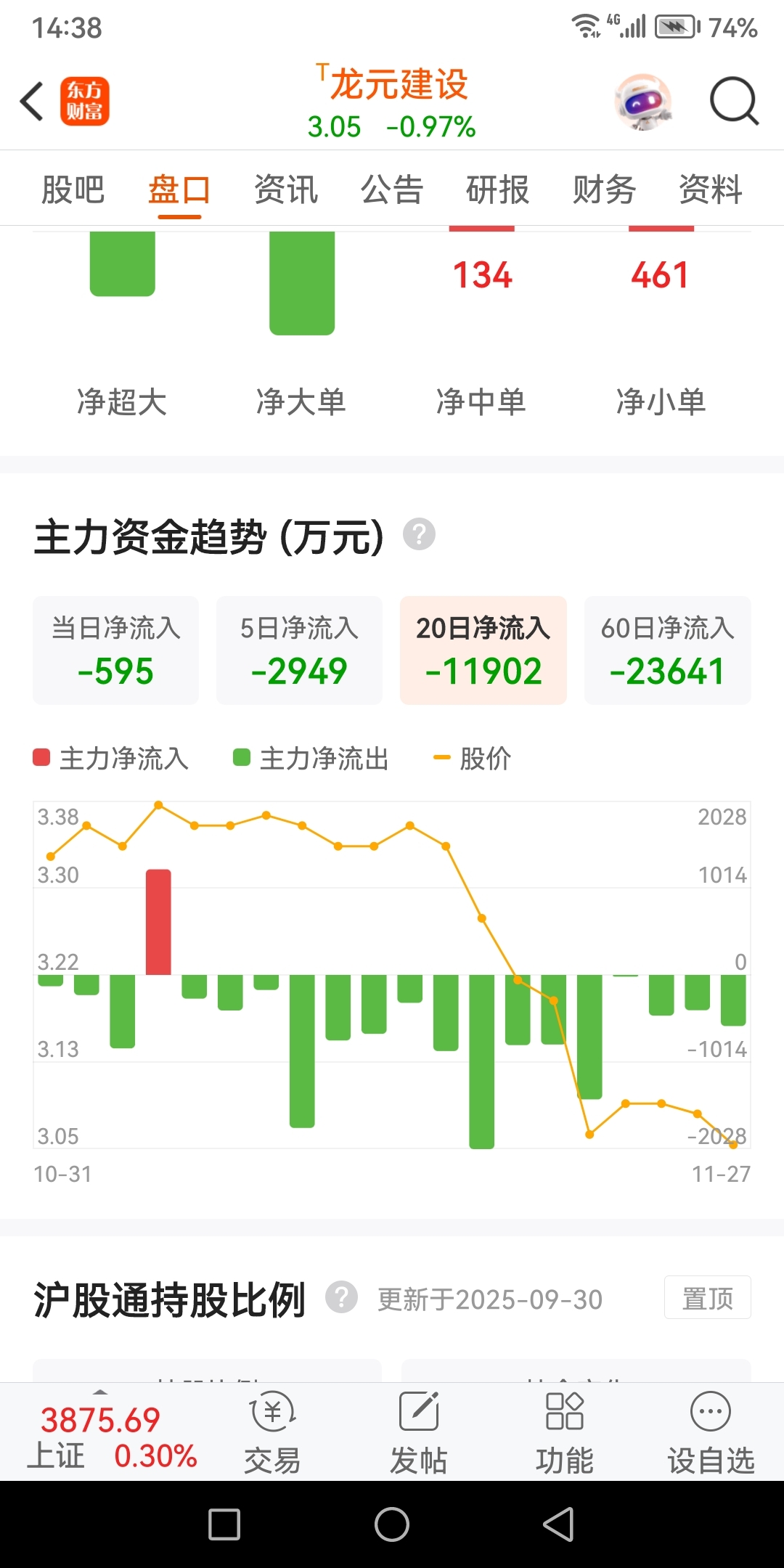 $龙元建设(SH600491)$ a股第一股,连续净流出差不多20天了