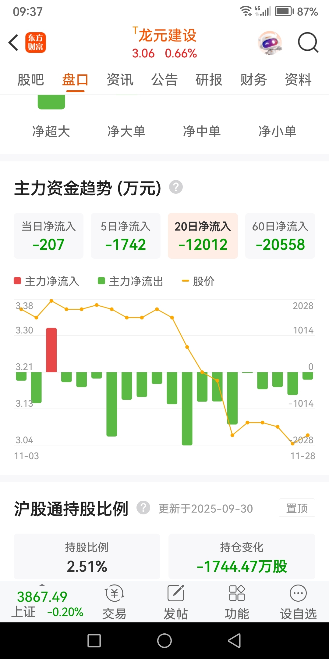 $龙元建设(SH600491)$ 马上破a股纪录,连续净流出20个交易日