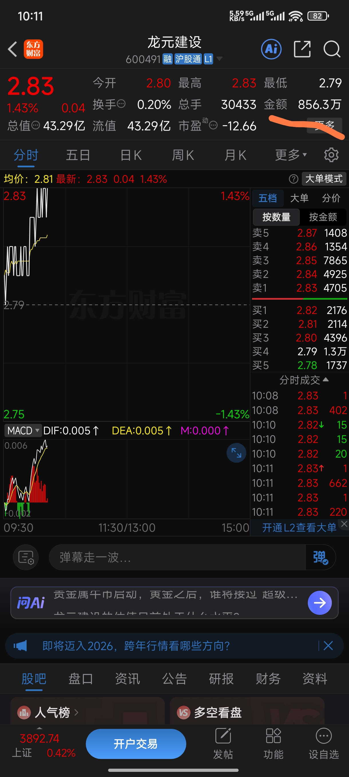 $龙元建设(SH600491)$ 800多万成交量。。。