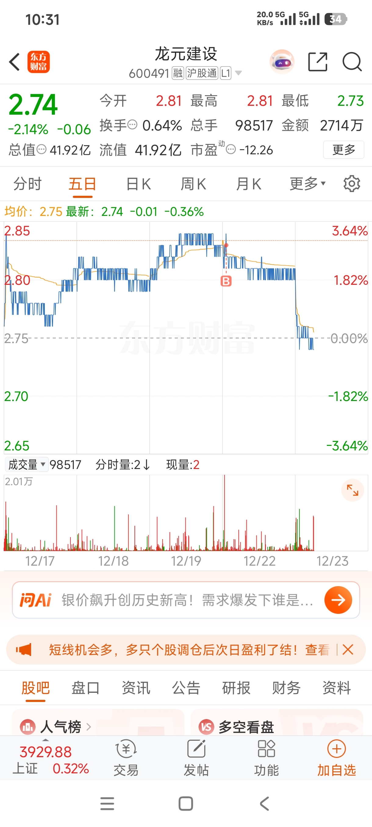 $龙元建设(SH600491)$ 这也能被套住?家人们请问要不要割肉?