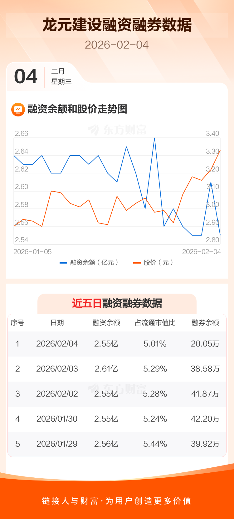 交易所最新数据显示,龙元建设于2026年2月4日获融资买入900.21万元,融资偿还1440.13万元,当日融资净偿还539.92万元。目前,该股融资余额2.55亿,占流通市值比例为5.01%。