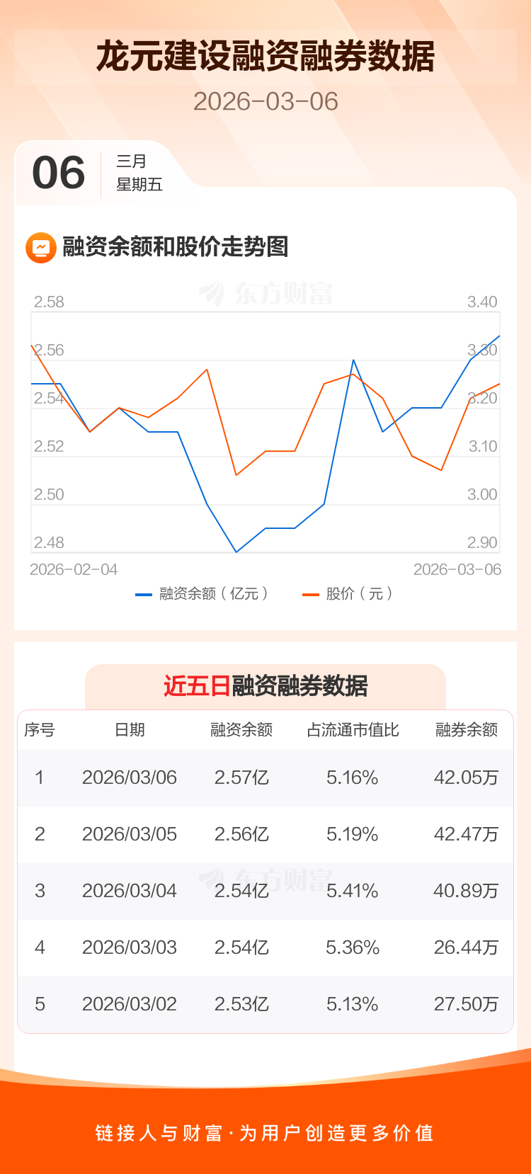 交易所最新数据显示,龙元建设于2026年3月6日获融资买入541.66万元,融资偿还456.01万元,当日融资净买入85.65万元。目前,该股融资余额2.57亿,占流通市值比例为5.16%。