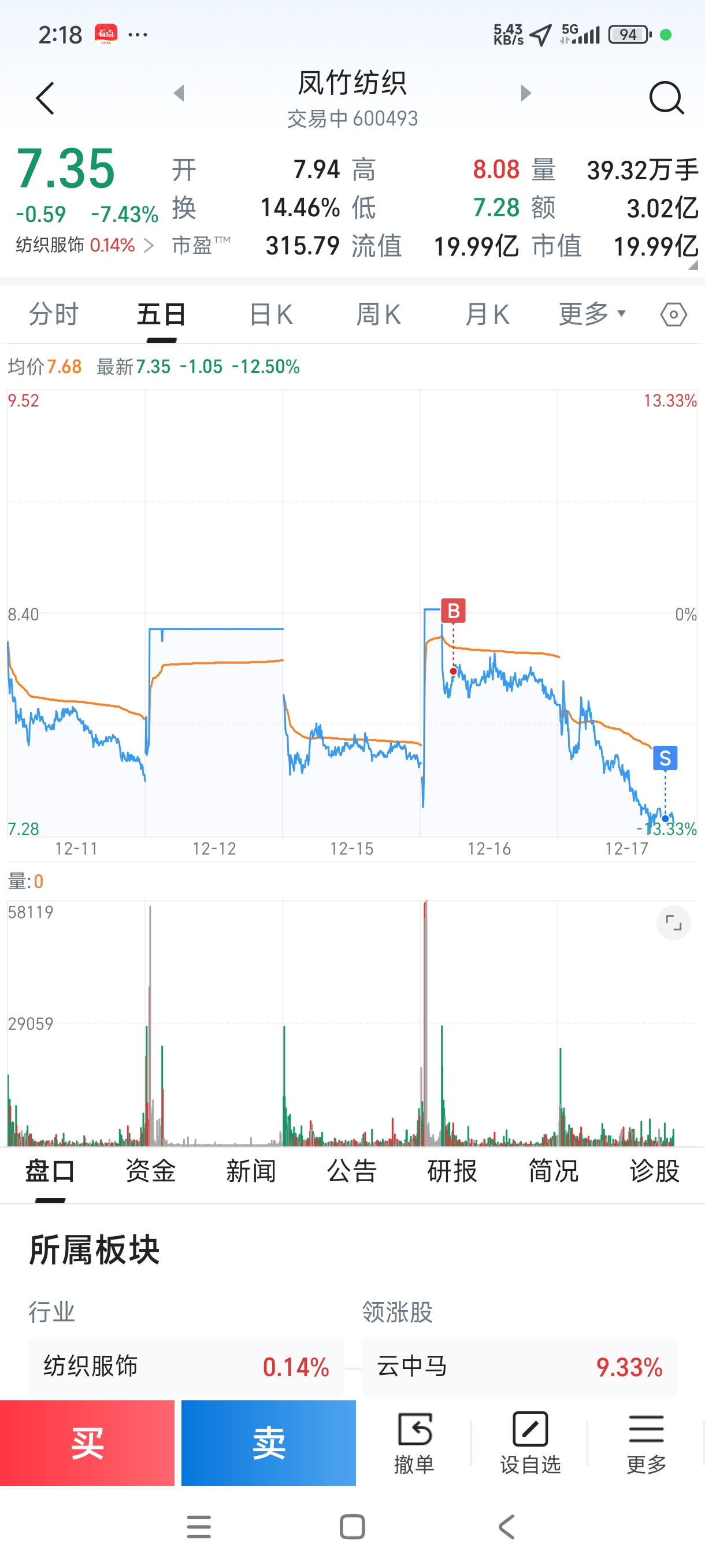 $凤竹纺织(SH600493)$ 小散们别耗了,总市值太小,整不好被st想出都出不去,没有无缘无故的疯狂,我先撤了,祝你们们发财