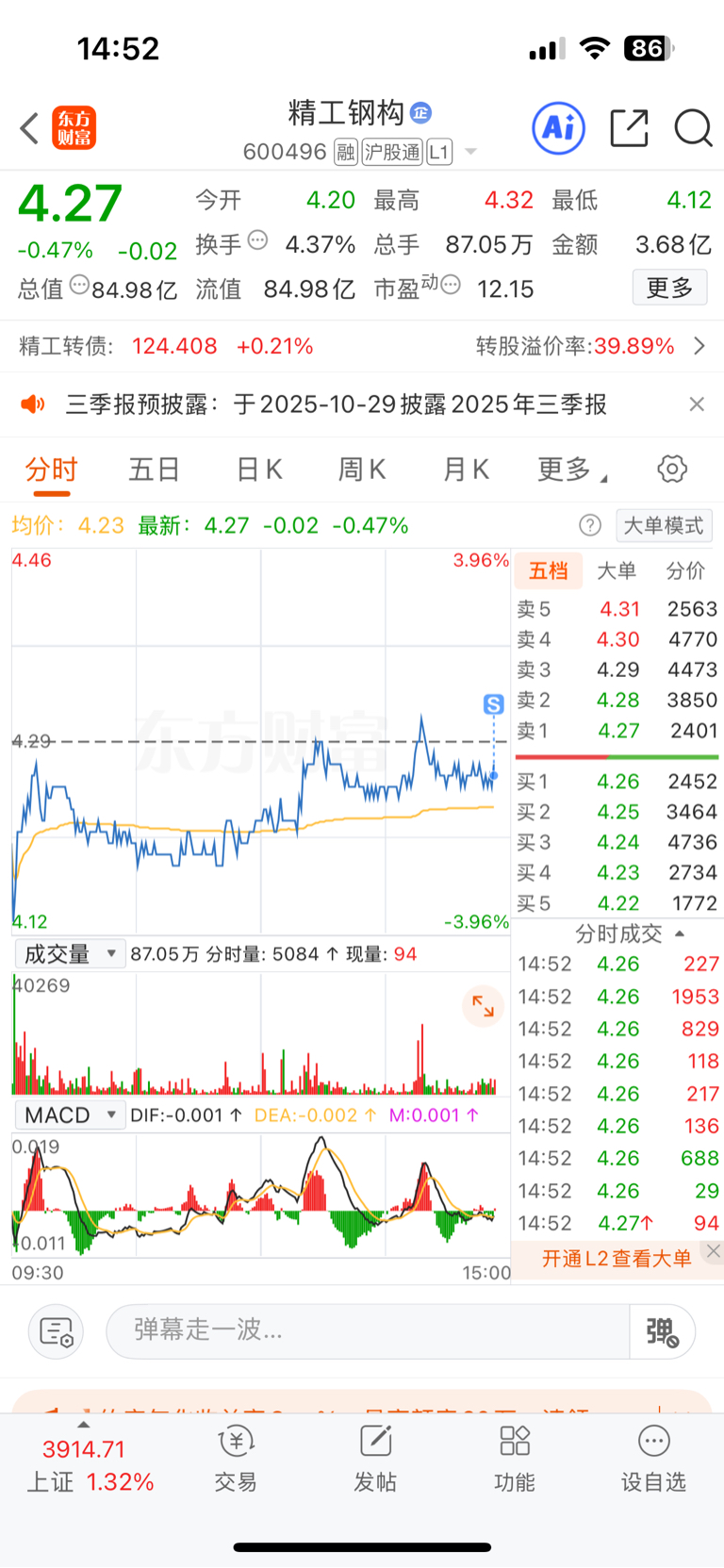 $精工钢构(SH600496)$ 算了,第四天没突破,按照按照原则还是先撤了