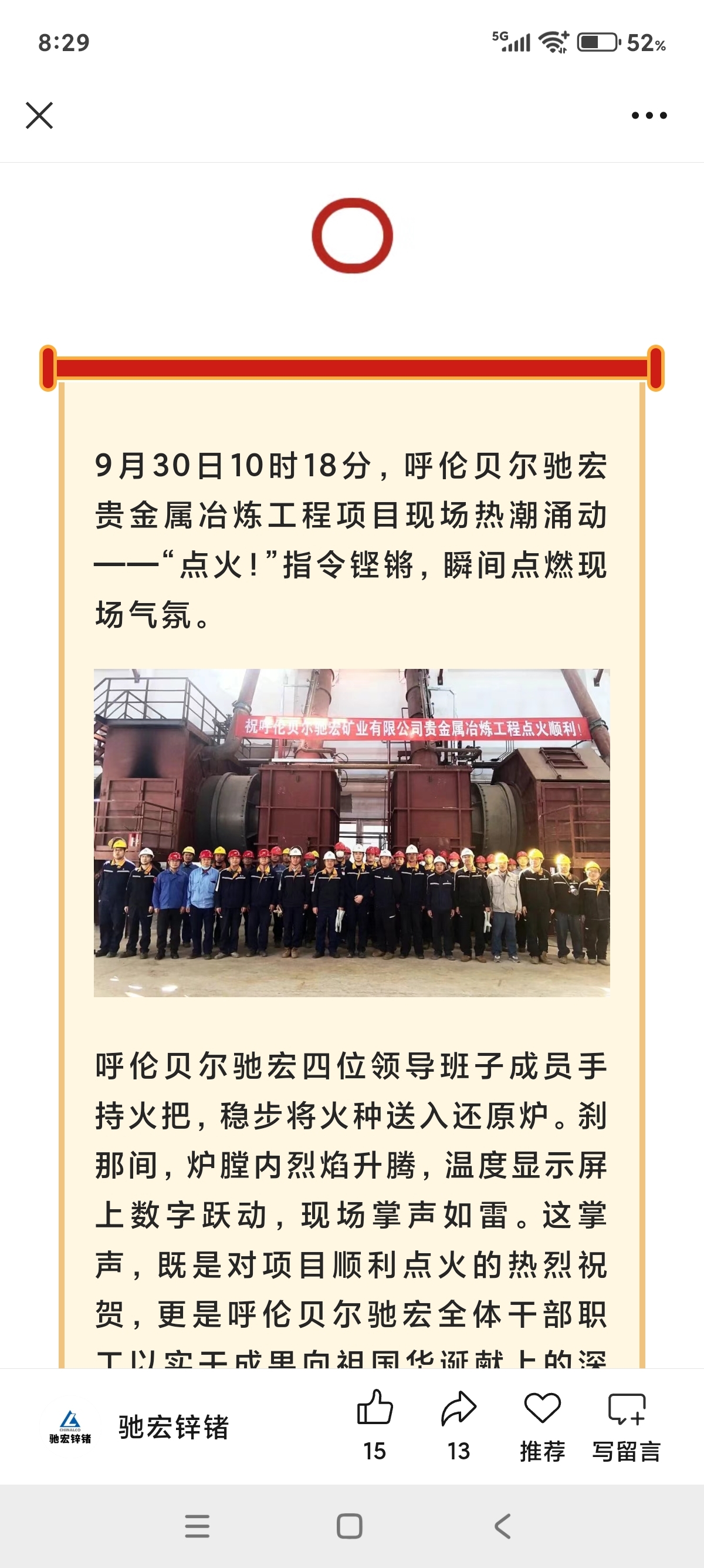 呼伦贝尔驰宏贵金属冶炼项目9.30点火成功,将为公司带来巨大收益。