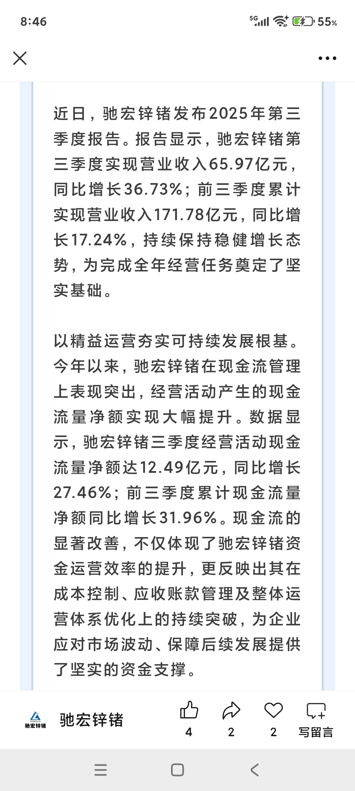 $驰宏锌锗(SH600497)$ 公司营业额大幅增长,流动资金同样大幅增长,四季度又有新公司点火和新矿井投产运营,现在不买更待何时?