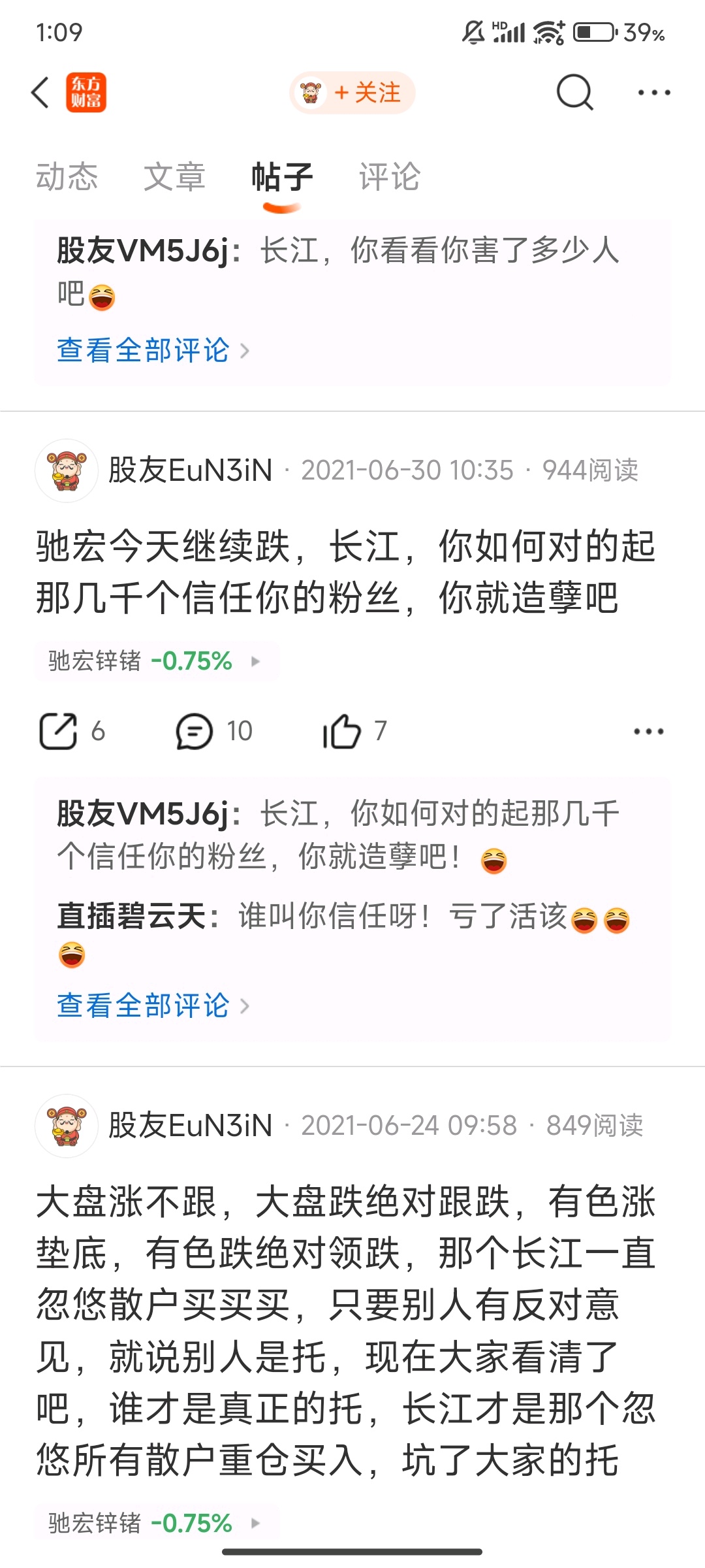 今晚讲故事回忆过去也是好玩!还有一个浙江的女人也是攻击我买驰宏也是发帖吵架。网名不记得了明天翻我的大号帖子就查得到那个女人!到时@一下她!时间过得真快炒股还是有意思又赚钱的同时又让人看清了人性!更是悟道了!现在财务自由了炒股当个乐字!在驰宏水军太多!机构的托也多!我看一眼发帖就知道谁是机构的托!欢迎评论区留言你在驰宏股吧见到的托的大名!必须真实可验证的哈!键盘侠就不要来大爷的帖子!以免一间小黑屋让你永世不得超脱!(见我个性签名)