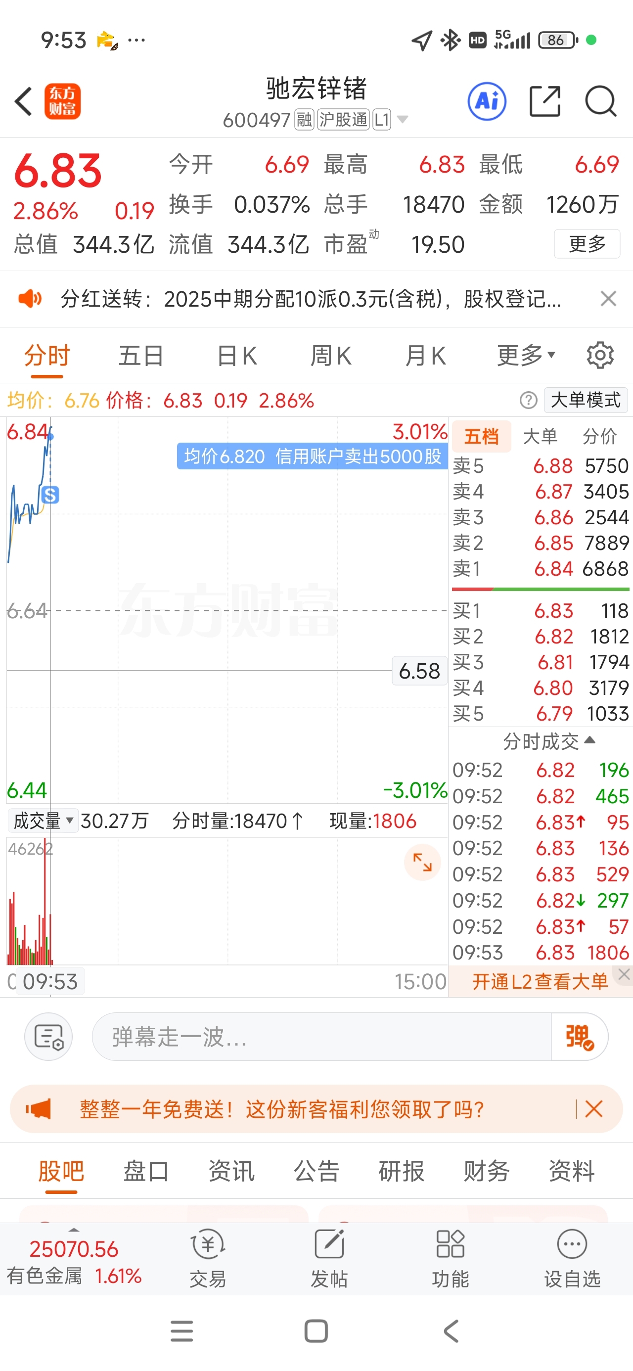 $驰宏锌锗(SH600497)$ 6.82清仓!!明天分红后再买!!