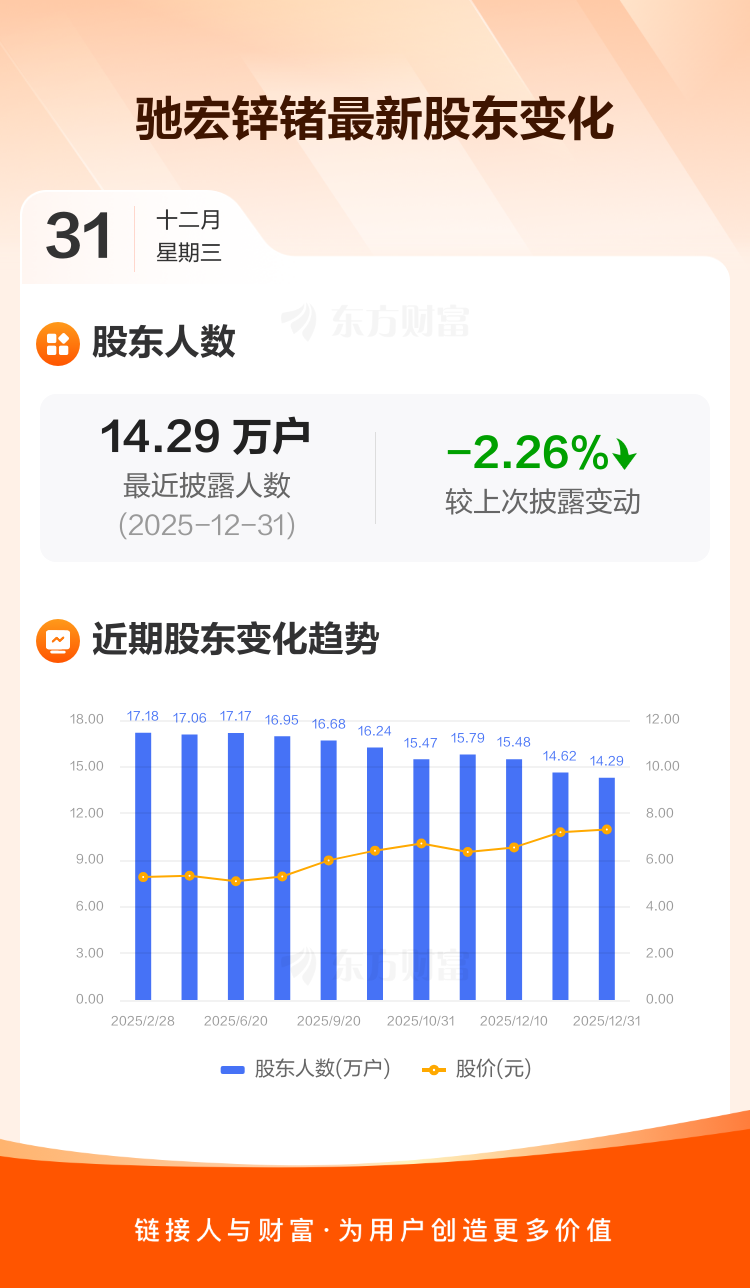 驰宏锌锗:截至12月31日最新股东户数14.29万户,较上期减少2.26%