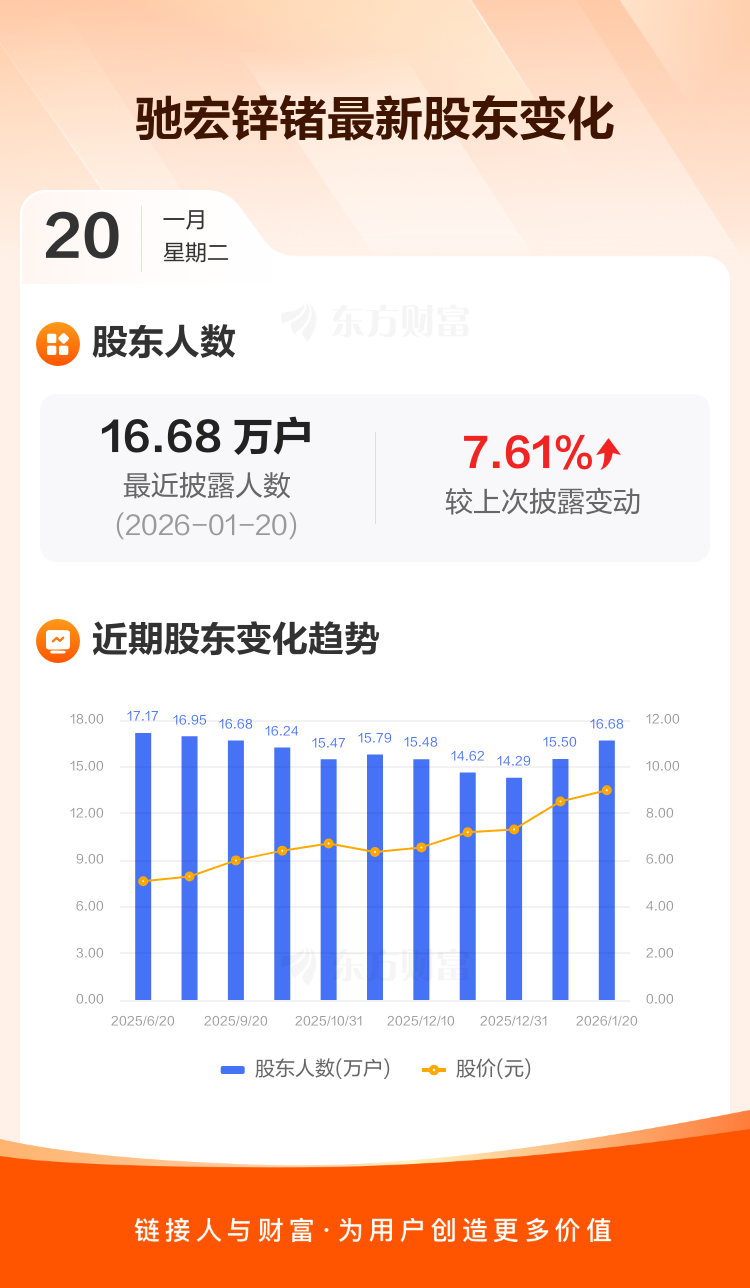 驰宏锌锗:截至1月20日最新股东户数16.68万户,较上期增加7.61%