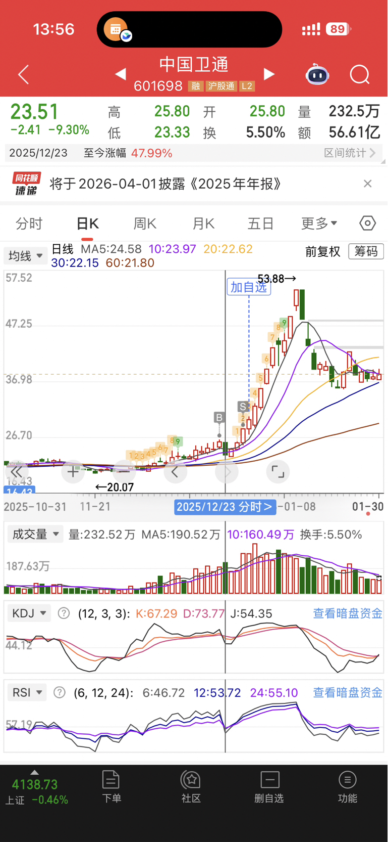 $驰宏锌锗(SH600497)$ 可以参考一下中国卫通在12.23的走势,千万别被吓跑了