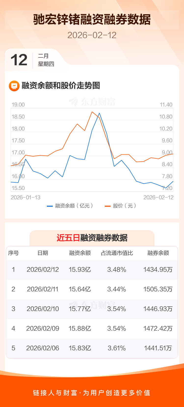 交易所最新数据显示,驰宏锌锗于2026年2月12日获融资买入1.20亿元,融资偿还9197.11万元,当日融资净买入2852.39万元。目前,该股融资余额15.93亿,占流通市值比例为3.48%。