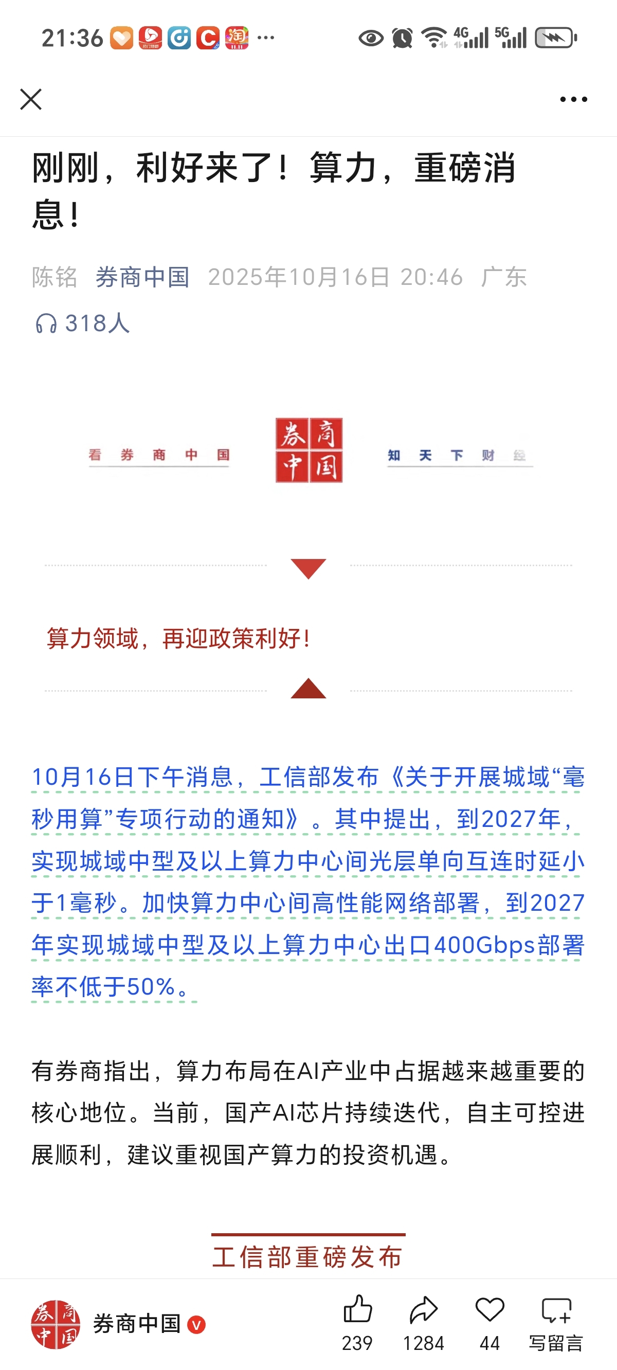 明天高开秒板10月16日下午消息,工信部发布《关于开展城域“毫秒用算”专项行动的