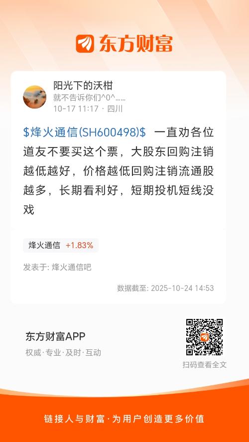 $烽火通信(SH600498)$ 一直劝各位道友不要买这个票,大股东回购注销越低越好,价格越低回购注销流通股越多,长期看利好,短期投机短线没戏