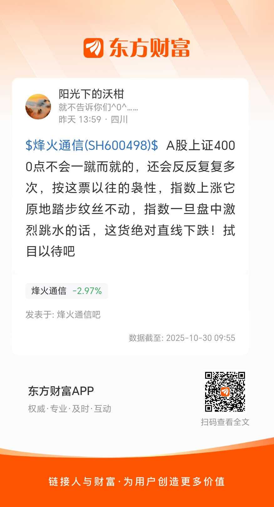 $烽火通信(SH600498)$ A股上证4000点不会一蹴而就的,还会反反复复多次,按这票以往的袅性,指数上涨它原地踏步纹丝不动,指数一旦盘中激烈跳水的话,这货绝对直线下跌!拭目以待吧