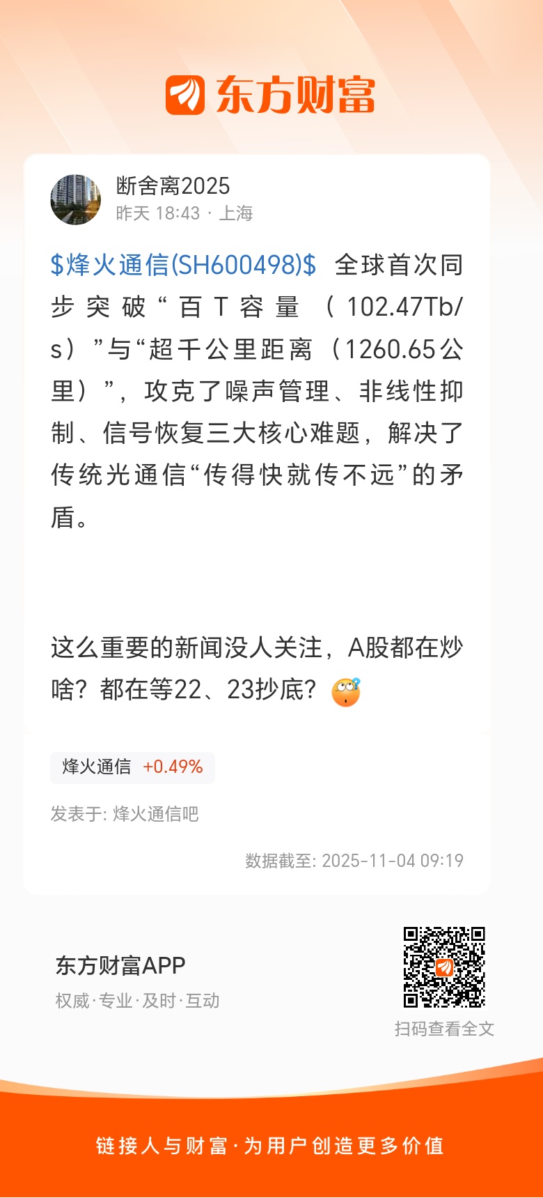 $烽火通信(SH600498)$ 全球首次同步突破“百T容量(102.47Tb/s)”与“超千公里距离(1260.65公里)”,攻克了噪声管理、非线性抑制、信号恢复三大核心难题,解决了传统光通信“传得快就传不远”的矛盾。