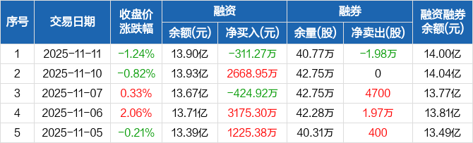 烽火通信:融资净偿还311.27万元,融资余额13.9亿元(11-11)