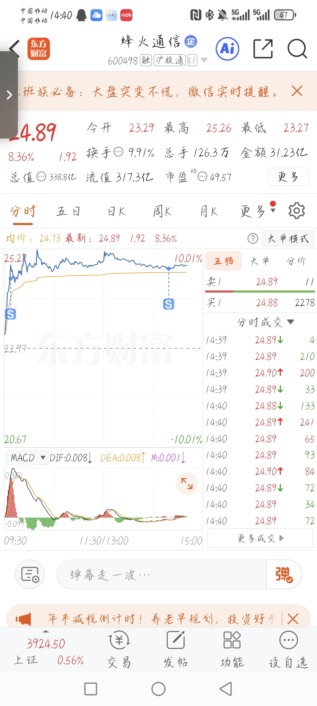 $烽火通信(SH600498)$ 不格局了,一直等板明天吃点溢价,算了,我还是跑了,前天进的,今天跑,
