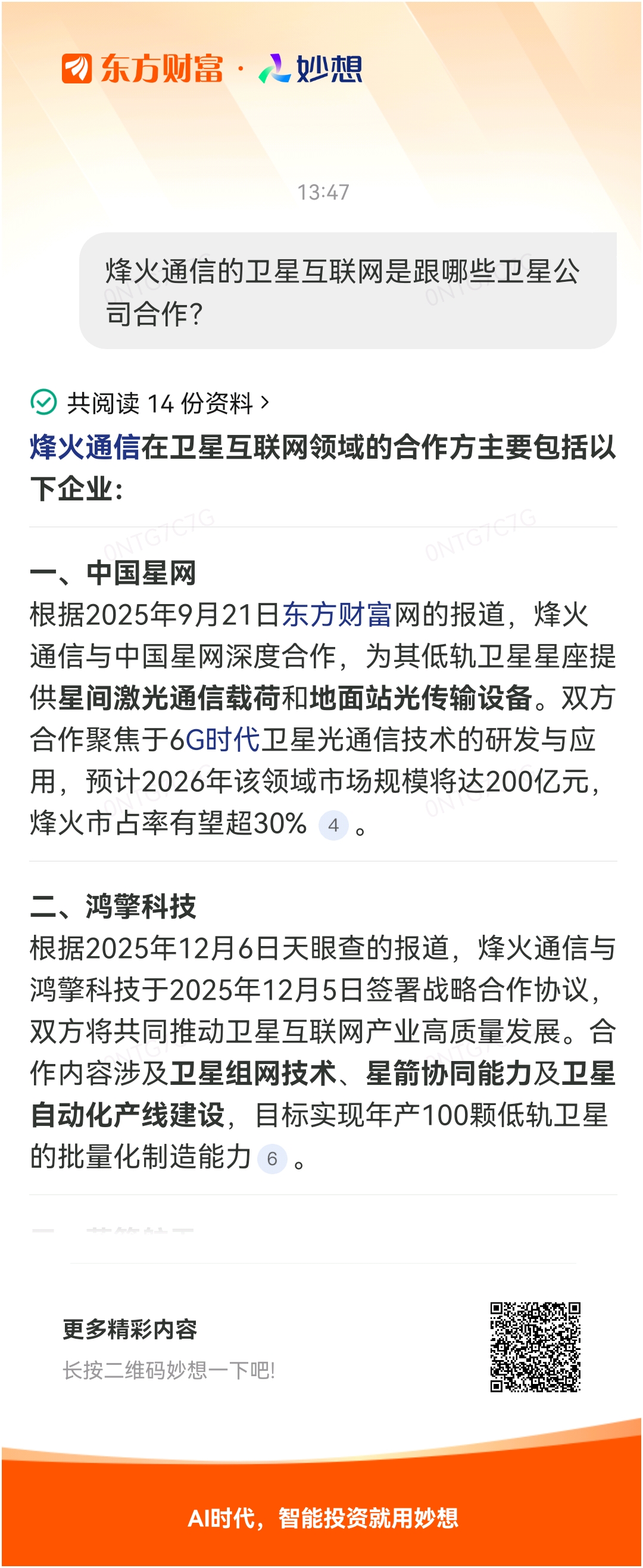 #@妙想,你怎么看?# 妙想一下:烽火通信的卫星互联网是跟哪些卫星公司合作?