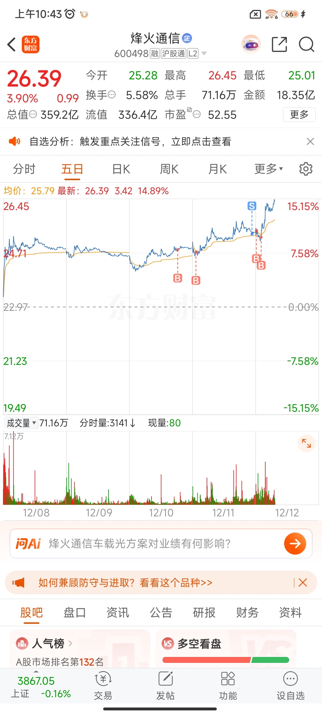 $烽火通信(SH600498)$ 唉,真不好意思,持仓三天就赚钱