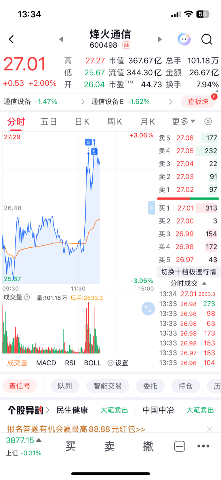 $烽火通信(SH600498)$ 感谢主力,让我又走了半仓