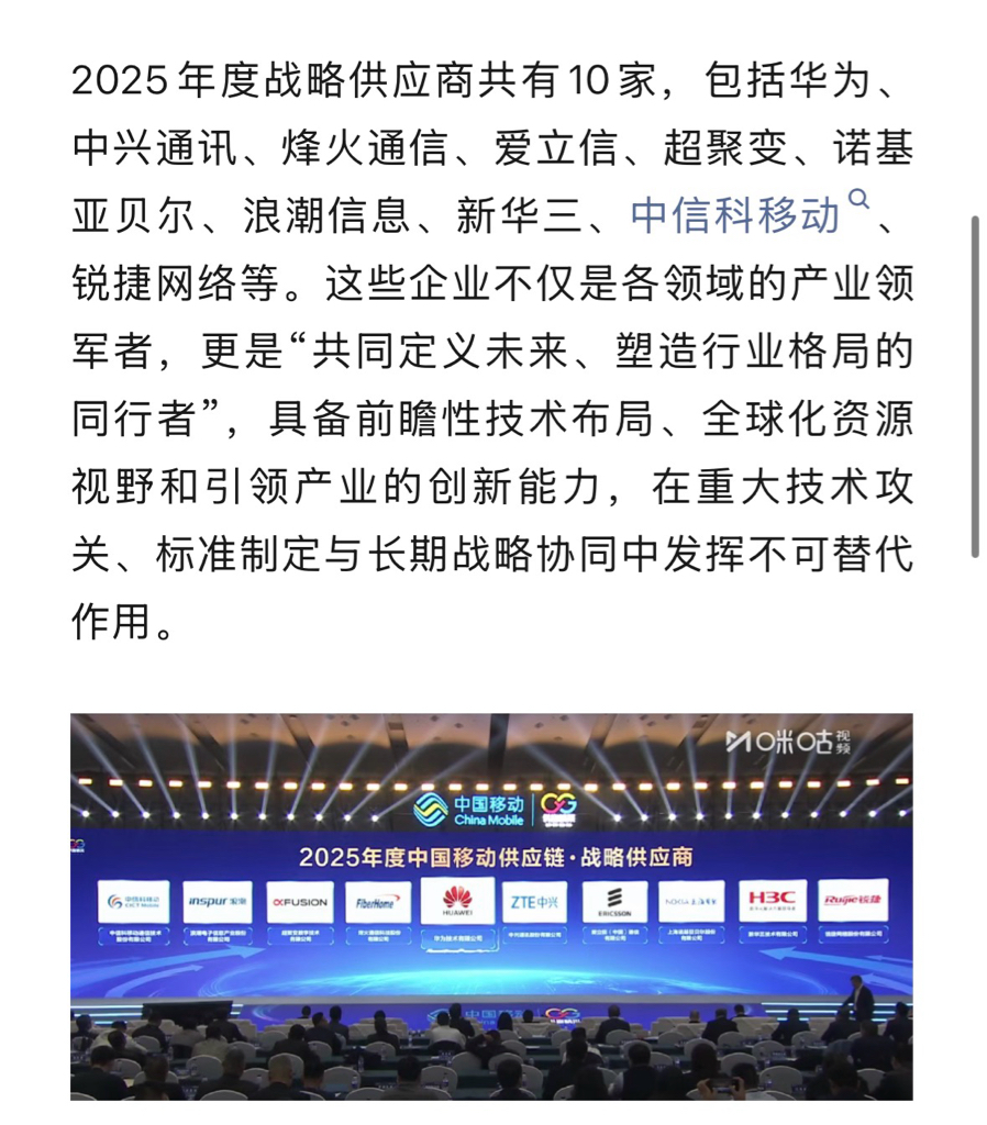 2025年度战略供应商共有10家,包括华为、中兴通讯、烽火通信、爱立信、超聚变、诺基亚贝尔、浪潮信息、新华三、中信科移动。