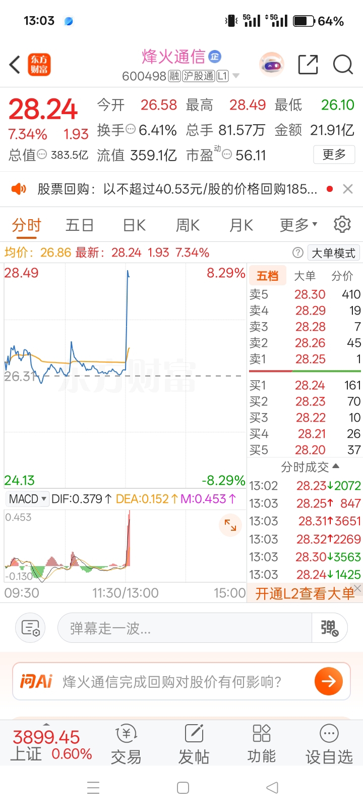 $烽火通信(SH600498)$ 昨日27块接力上车的兄弟,今天可以吃肉下车了!!