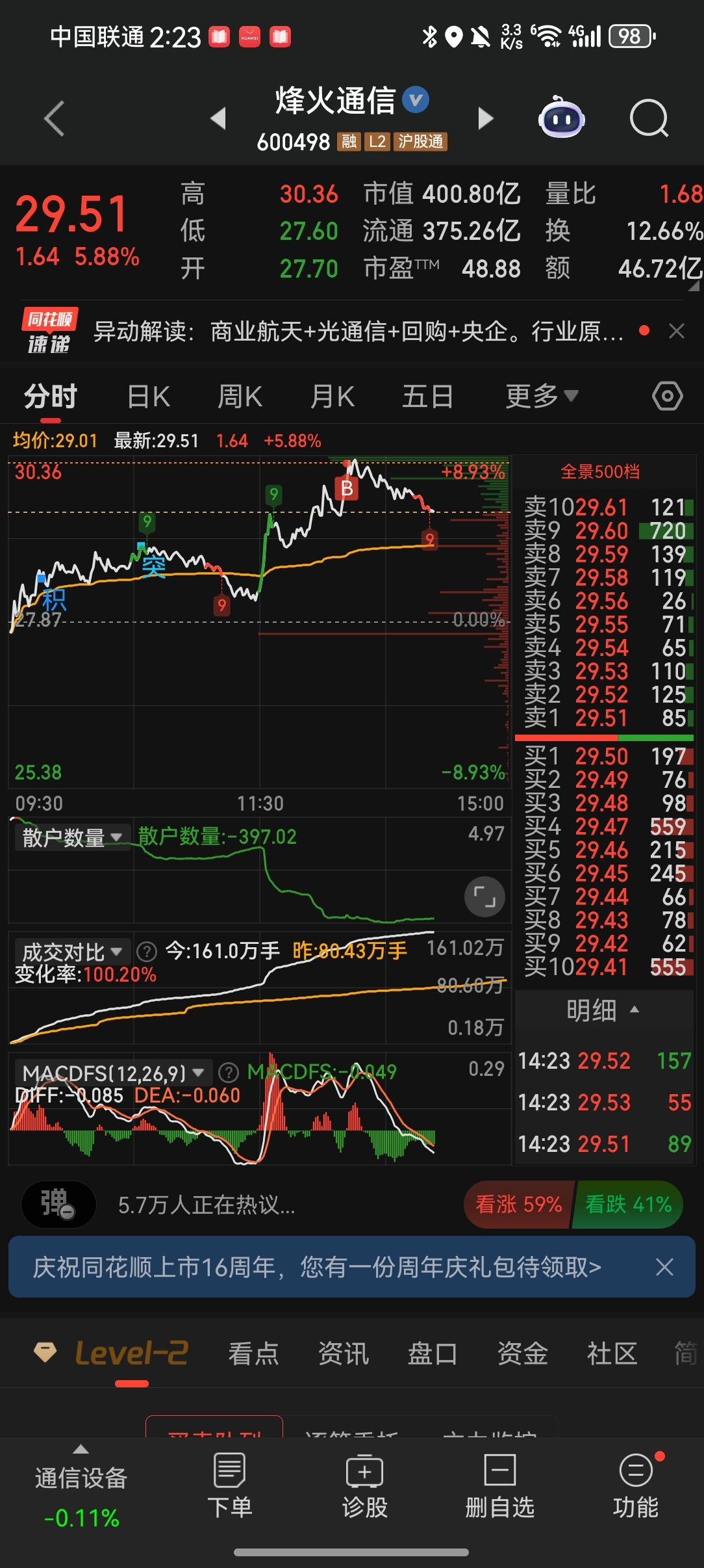 $烽火通信(SH600498)$ 我对不住大家在30块2毛4买了1手