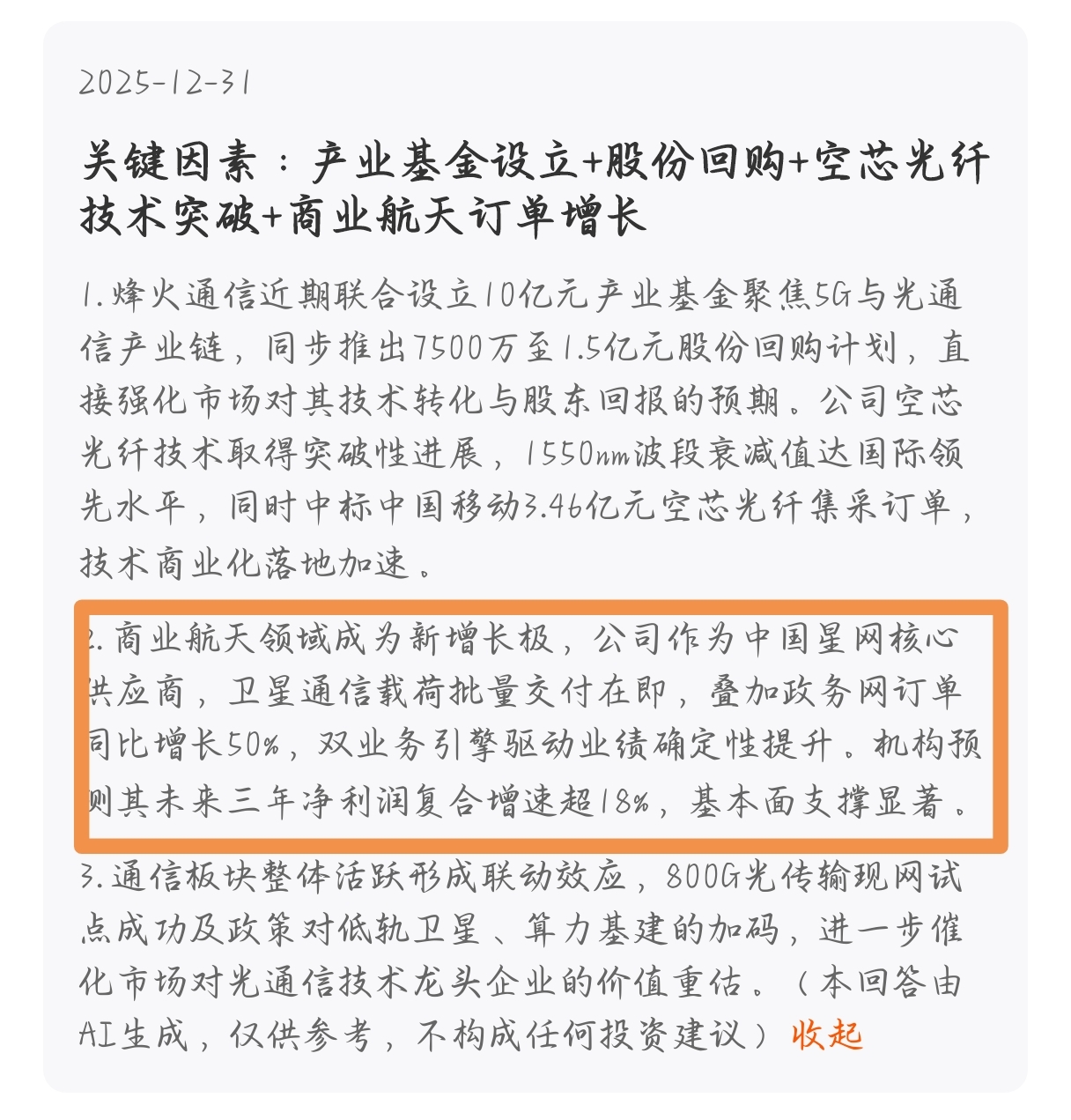 马斯克叫星链计划,我们国家叫星网计划,你还是核心供应商,卫星通讯交付在即。这个有
