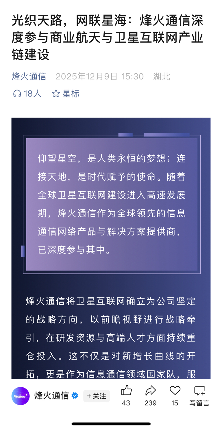 $烽火通信(SH600498)$ 光织天路,网联星海!仰望星空,未来已来!
