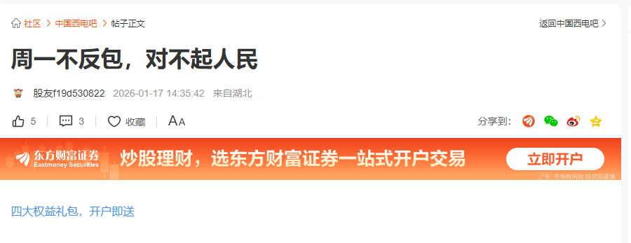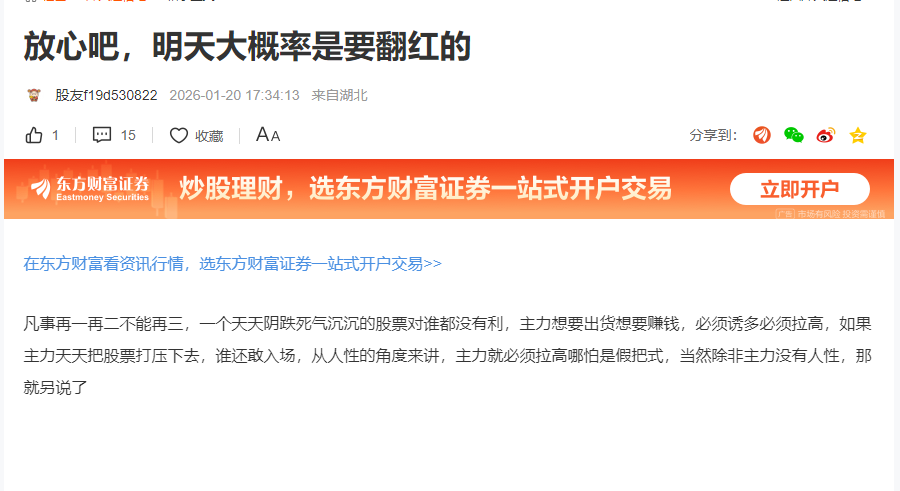 温馨提示: 1.根据《证券法》规定,禁止编造、传播虚假信息或者误导性信息,扰乱证券市场;2.用户在本社区发表的所有资料、言论等仅代表个人观点,与本网站立场无关,不对您构成任何投资建议。用户应基于自己的独立判断,自行决定证券投资并承担相应风险。《东方财富社区管理规定》