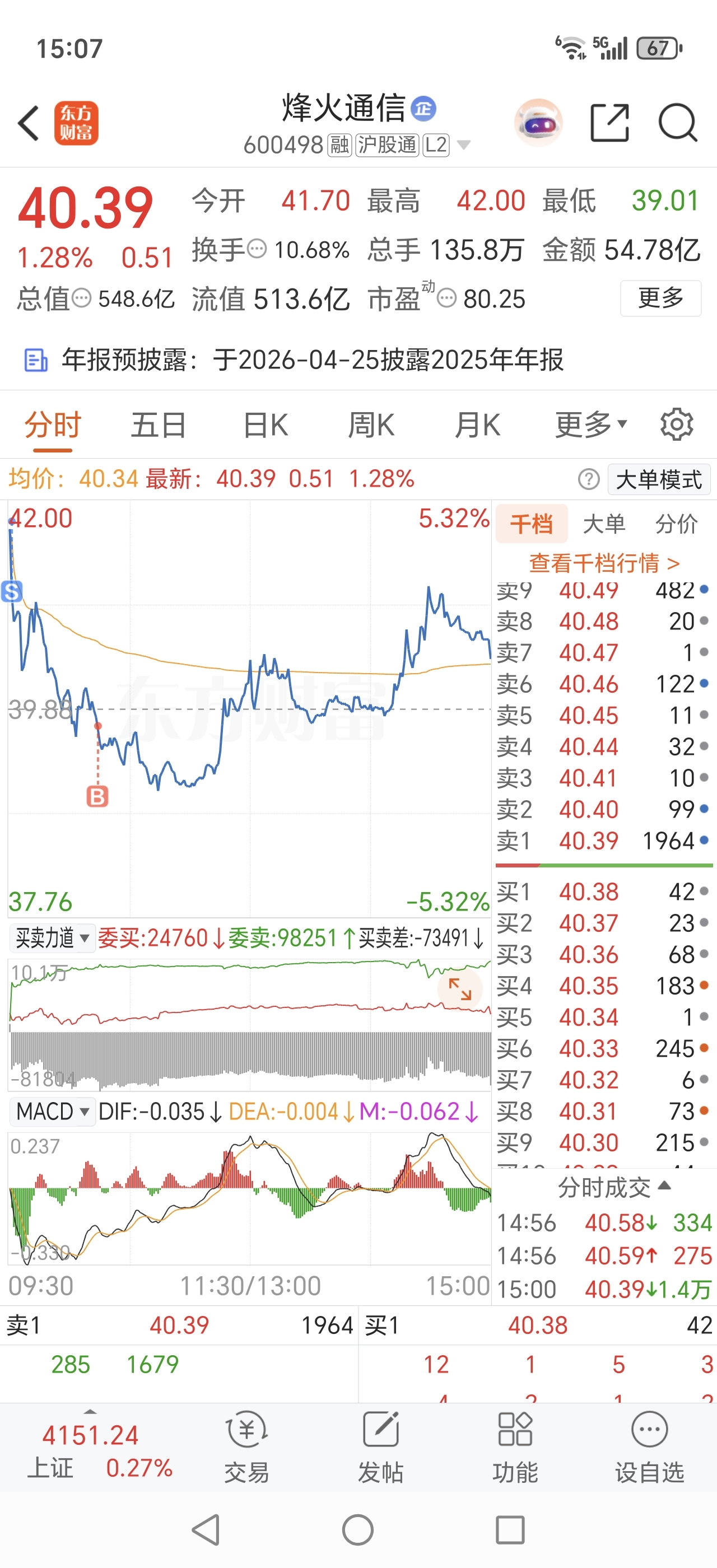 $烽火通信(SH600498)$ 早上开盘41.76撤退,快中午39.71买入,明天该如何操作?