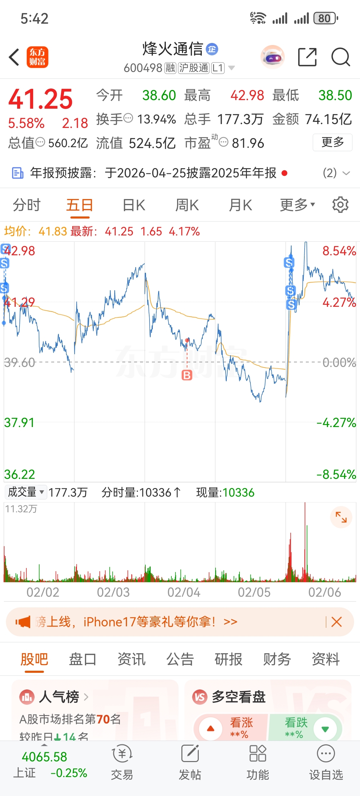$烽火通信(SH600498)$ 卧槽,这人气爆棚啊,周五难道卖错了