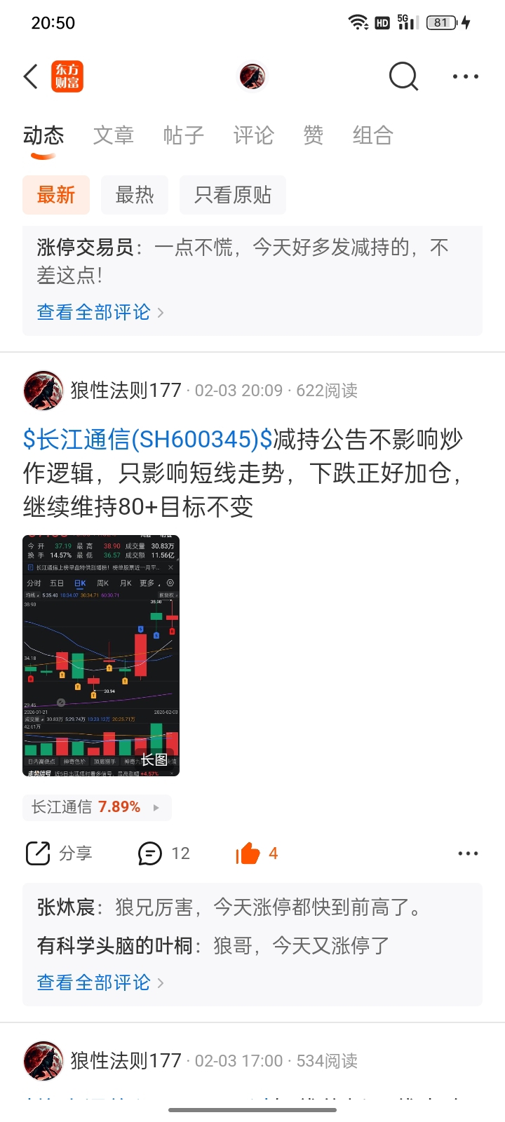 把2.3日发长江通信的话在烽火通信再发一遍,减持公告不影响炒作逻辑,只影响短线走