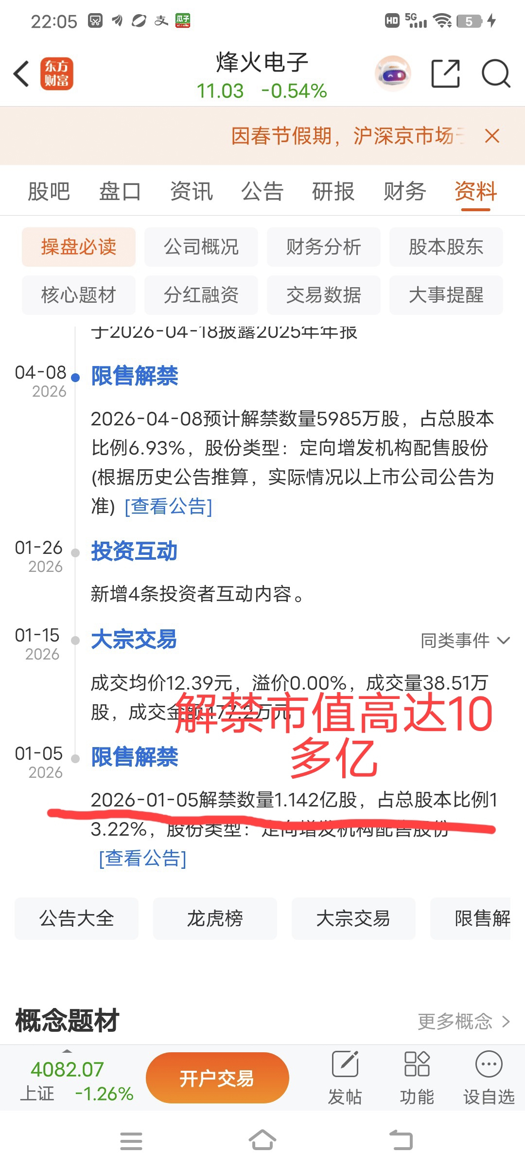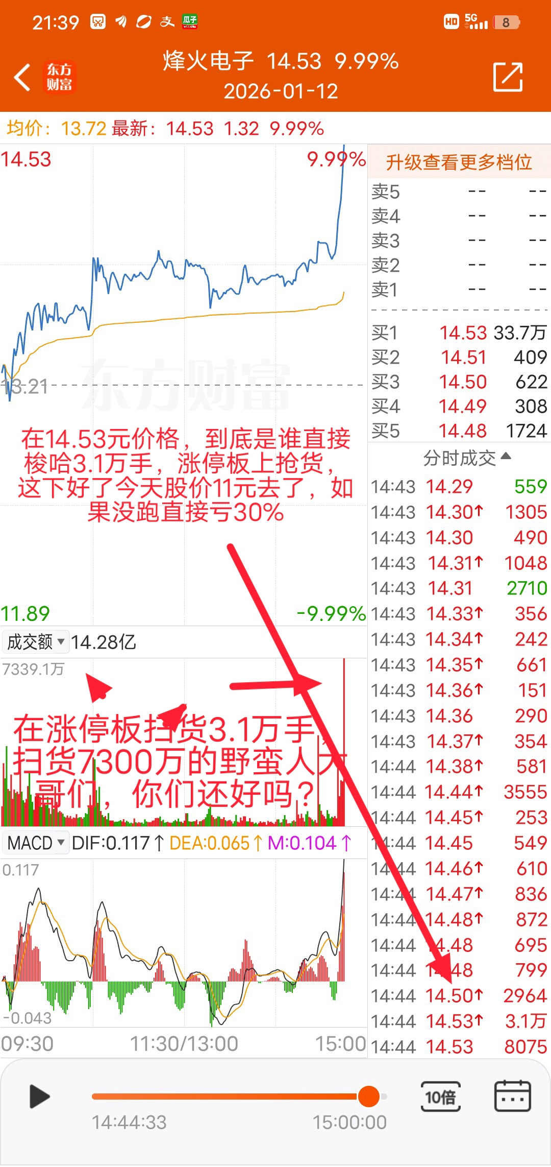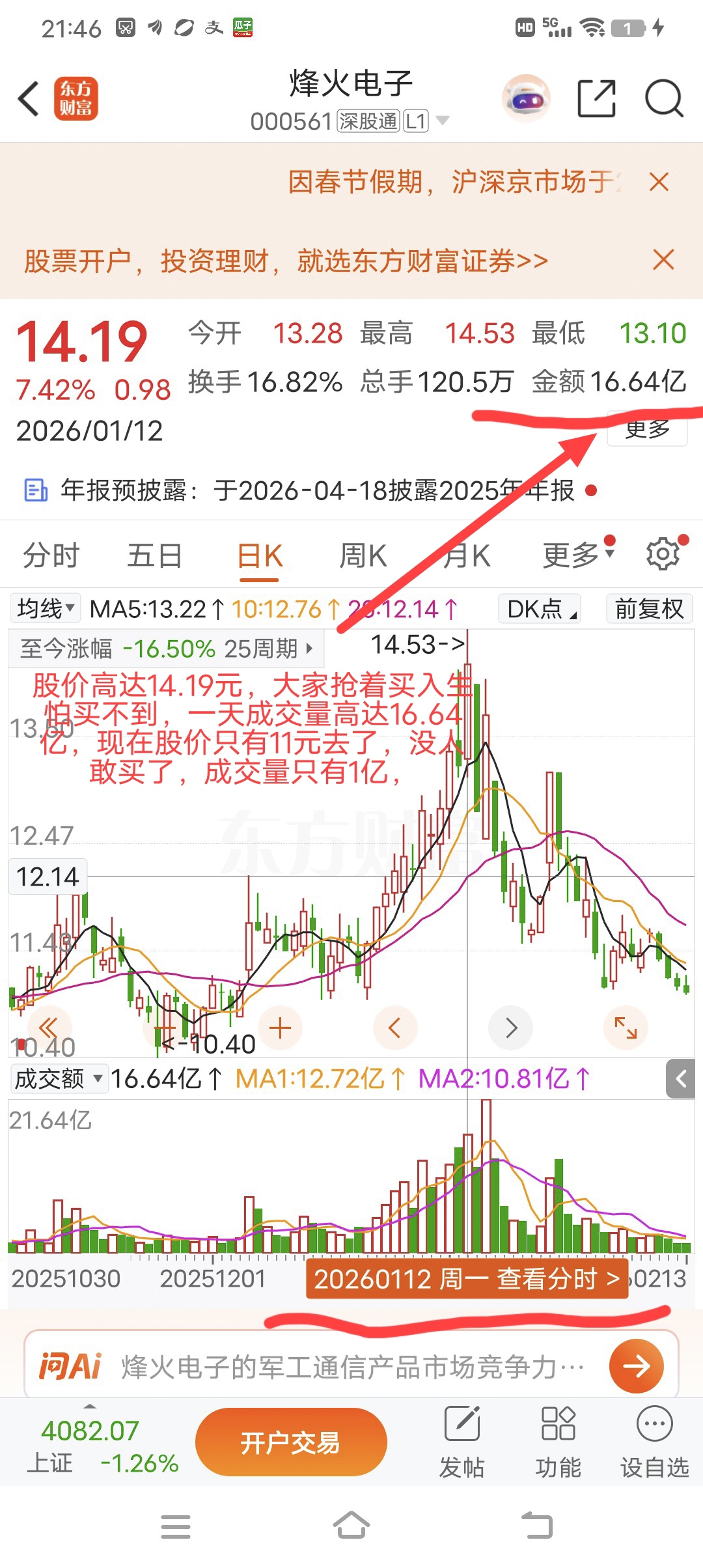 $烽火通信(SH600498)$ $烽火电子(SZ000561)$ 到底是哪个好心人大哥们,顶着业绩巨亏,股股东大规模解禁的风险,拉涨停板,这下好了,全部套在山顶了,14元,扫货怎么那么牛,成交量高达16亿昨天成交量才1亿多,昨天如果扫货16亿,估计就涨停过年不好吗?真是没意思,,,,