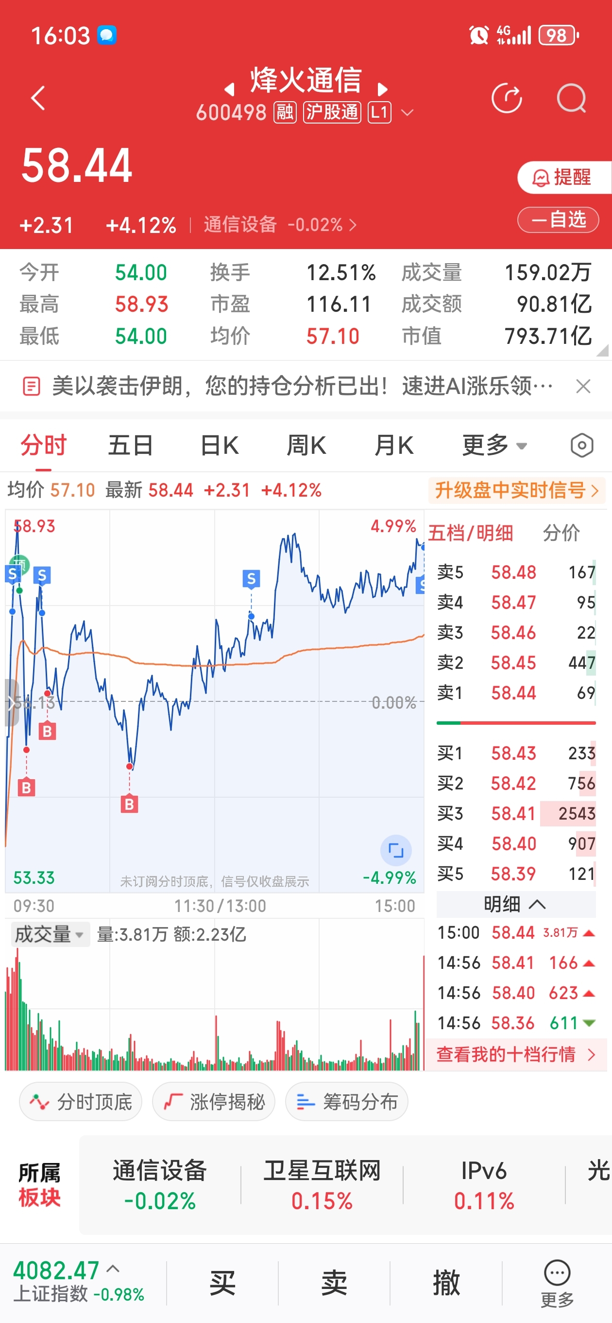$烽火通信(SH600498)$ 昨天接回来,以为今天吃大面,没想到啊,今天还是靠你吃肉