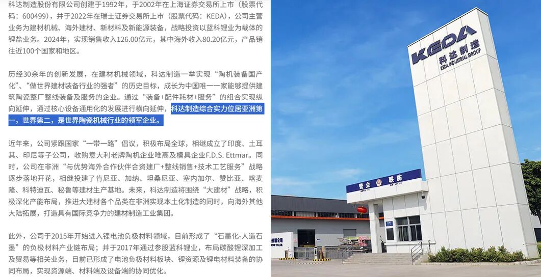 “为中国唯一一家能够提供建筑陶瓷整厂整线装备及服务的企业。”其在官网称,公司综合实力位居亚洲第一,世界第二。