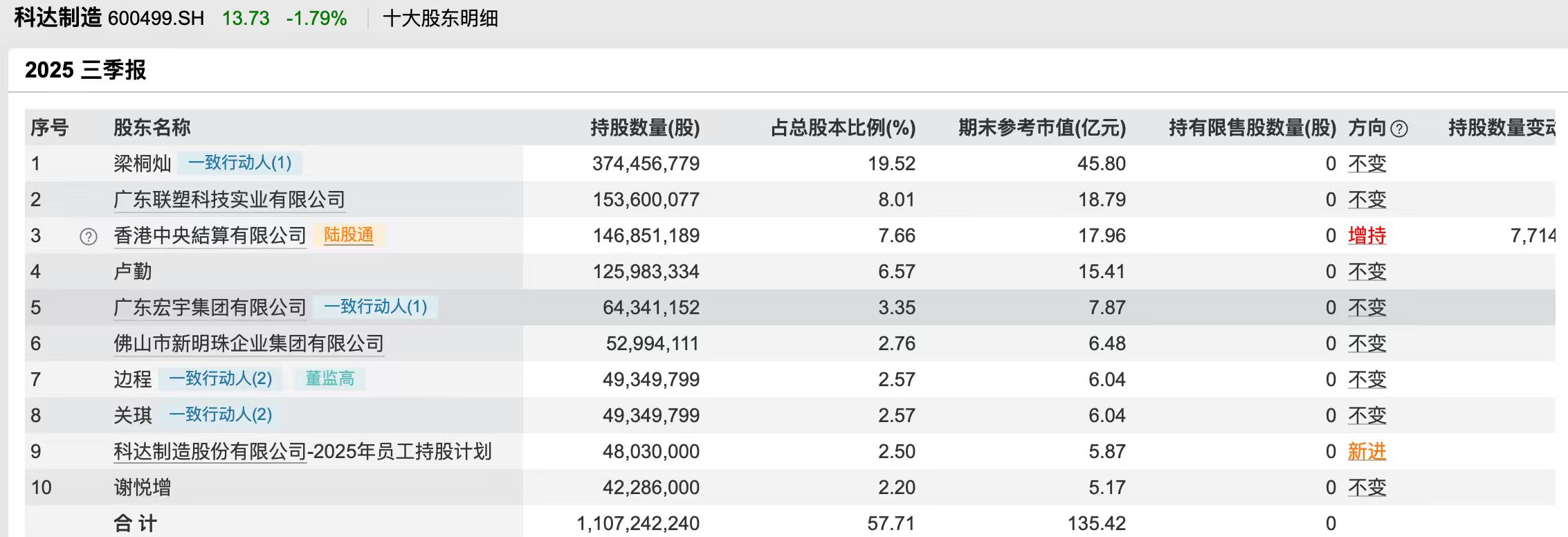 梁桐灿在2011年进入股东名单,2018年开始不断增持。至今,他个人和宏宇集团,在科达合计持股22.87%。